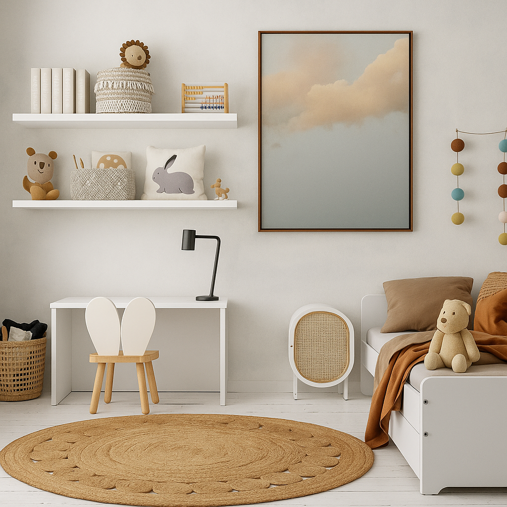 A calming space for rest, focus, and quiet exploration, with accessible shelves, soft textures, and a muted palette that supports ease