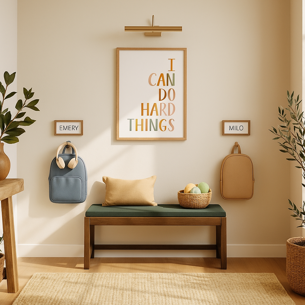 Formkind transition space with bench, baskets, and hooks — supporting daily rhythms, readiness, and confidence